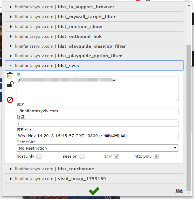登录进 Lodestone 并选择好角色,打开刚才的扩展,找到 ldst_sess 这个项目,将值复制出来备用。